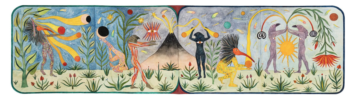 Rithika Merchant, Fieldwork, 2025, gouache, watercolour, ink and gel pen on paper, 14¾ x 54¾ in.