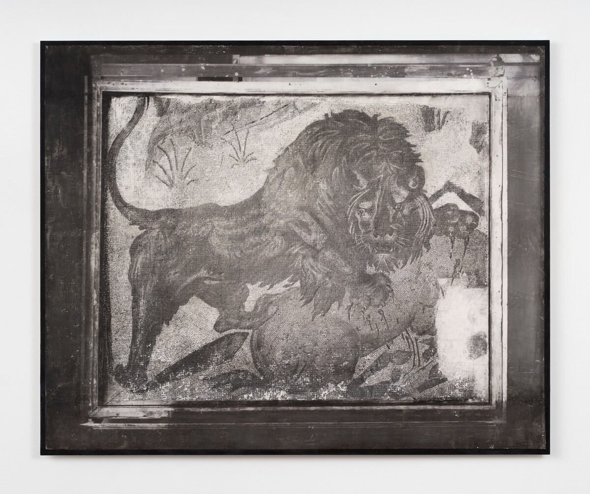 Tongue in hand reproduces an image of a 3rd century Carthaginian mosaic, first discovered by Europeans in Tunisia in 1873 and subsequently displayed at the American Centennial Exposition in Philadelphia in 1876, prior to its donation to the National Gallery. Depicting a North African lion attacking in a bloody act of killing its prey, the image functions as a mythological prologue to the centuries of violent domination that would shape the histories of the Mediterranean, and subsequently, the Americas. Notes on embodiment originates from a 20th century photograph taken by museum staff of a partially taxidermied lion staged in the museum’s storage area. The animal’s skull displayed on a rough assemblage of wood and wire, and staged before a photographic backdrop, Mendez’s work calls attention to the series of decisions touching on ideas of fact and fiction. Tracing how power is articulated and propagated, Mendez presents both archival images as unstable constructs. Mendez re-contextualizes the archival images as objects of power, originally produced in service of metaphorical representations of the violence that created the Americas and continues to foster its myths.
