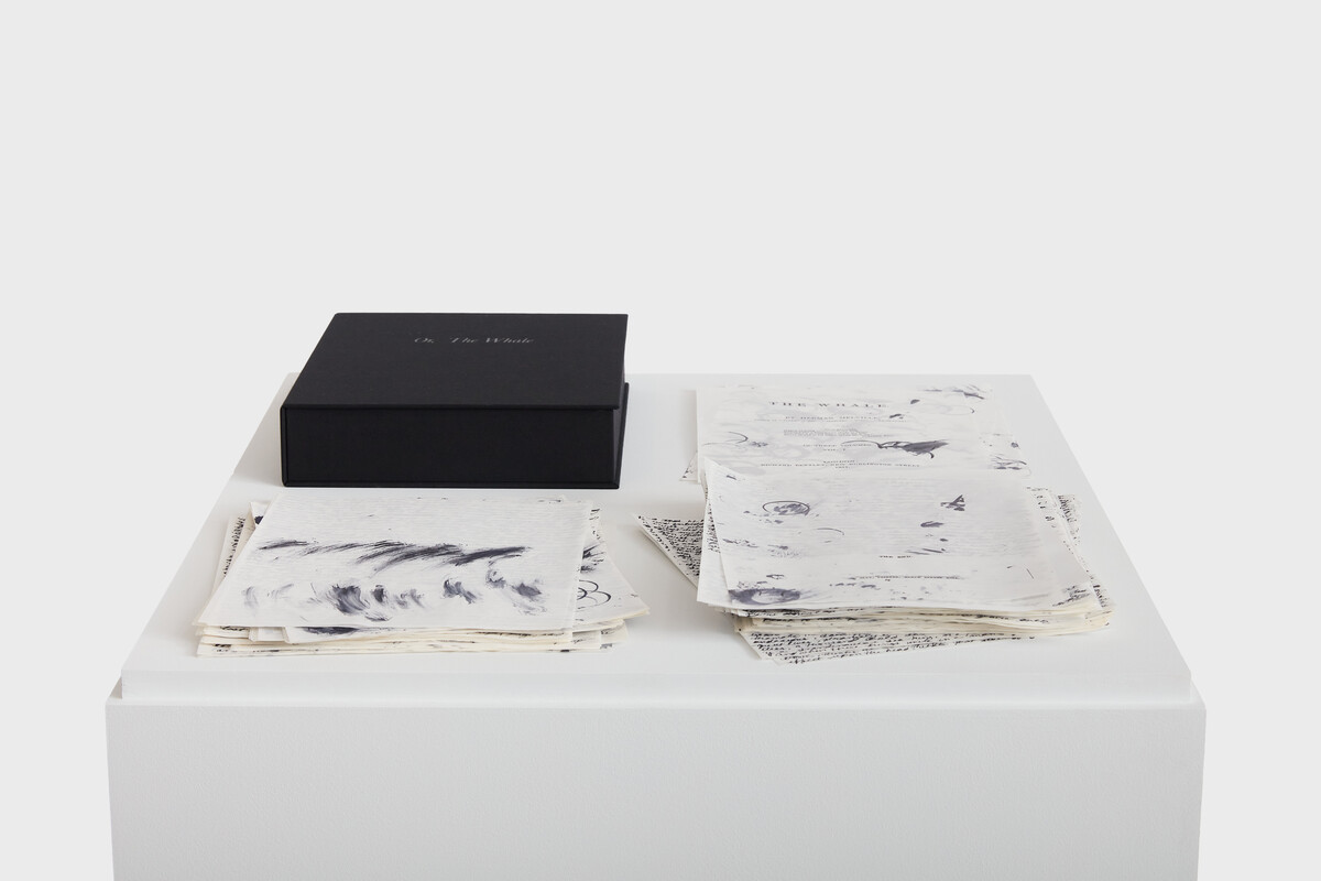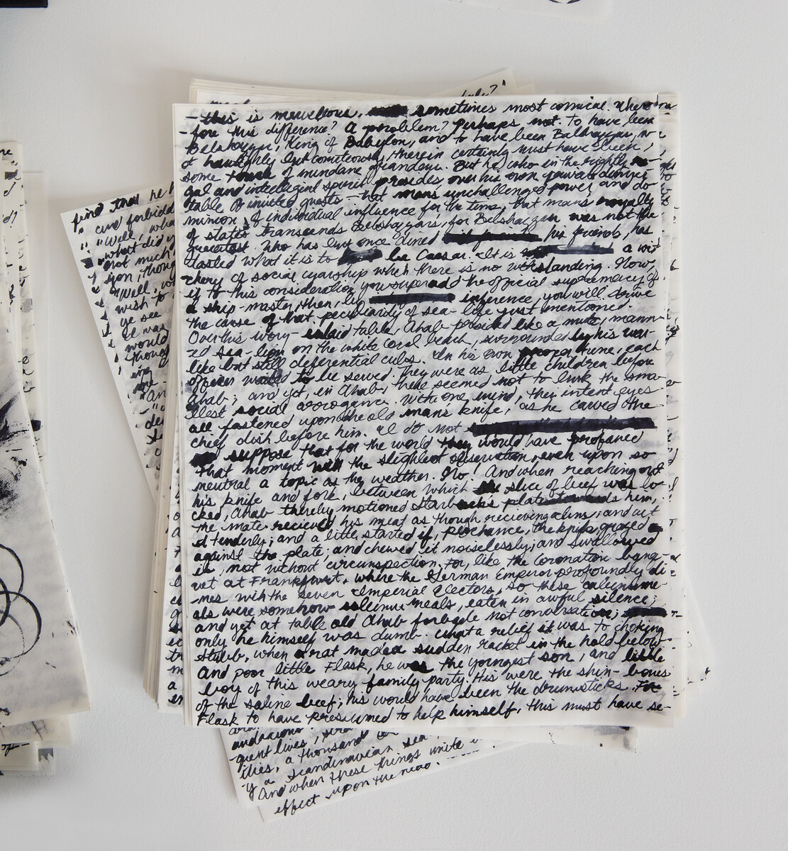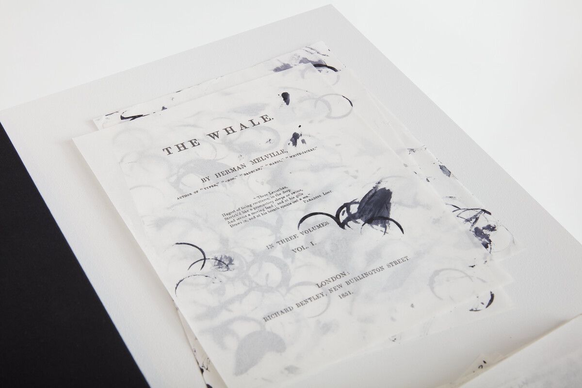 Speaking directly to these prevailing tides, the exhibition centers on Or, The Whale, Vol. 1 and 2, part of Collins’s three-volume series transcribing Herman Melville’s 1851 novel Moby Dick. Historian Nathaniel Philbrick refers to the novel as an “American Bible,” a literary exploration of loss, salvation, and the dark consequences of an unrepentant spirit. Collins has undertaken the meticulous and labor-intensive act of transcription, writing out the pages of the book’s first and second volumes onto nearly translucent onion-skin paper using iron gall ink. Developed in the 4th century, the ink was lauded for its permanence — it cannot be erased through rubbing or washing — yet is inherently corrosive due to its acidity, gradually eating away at the surface it touches. In transcribing Melville’s text this way, Collins infuses one of the nation’s most archetypal works with an “inherent vice” (a conservation term), transforming the act of preservation into one of slow dissolution. The work evokes the dual pull of endurance and decay — an image of faith eroded by its own persistence.