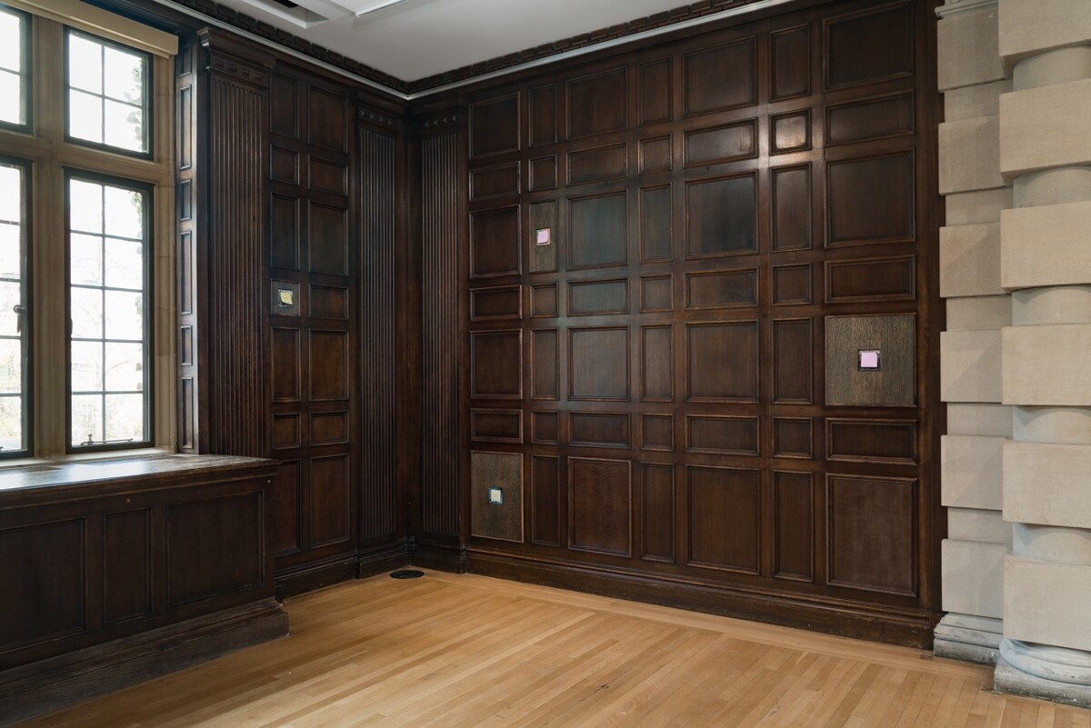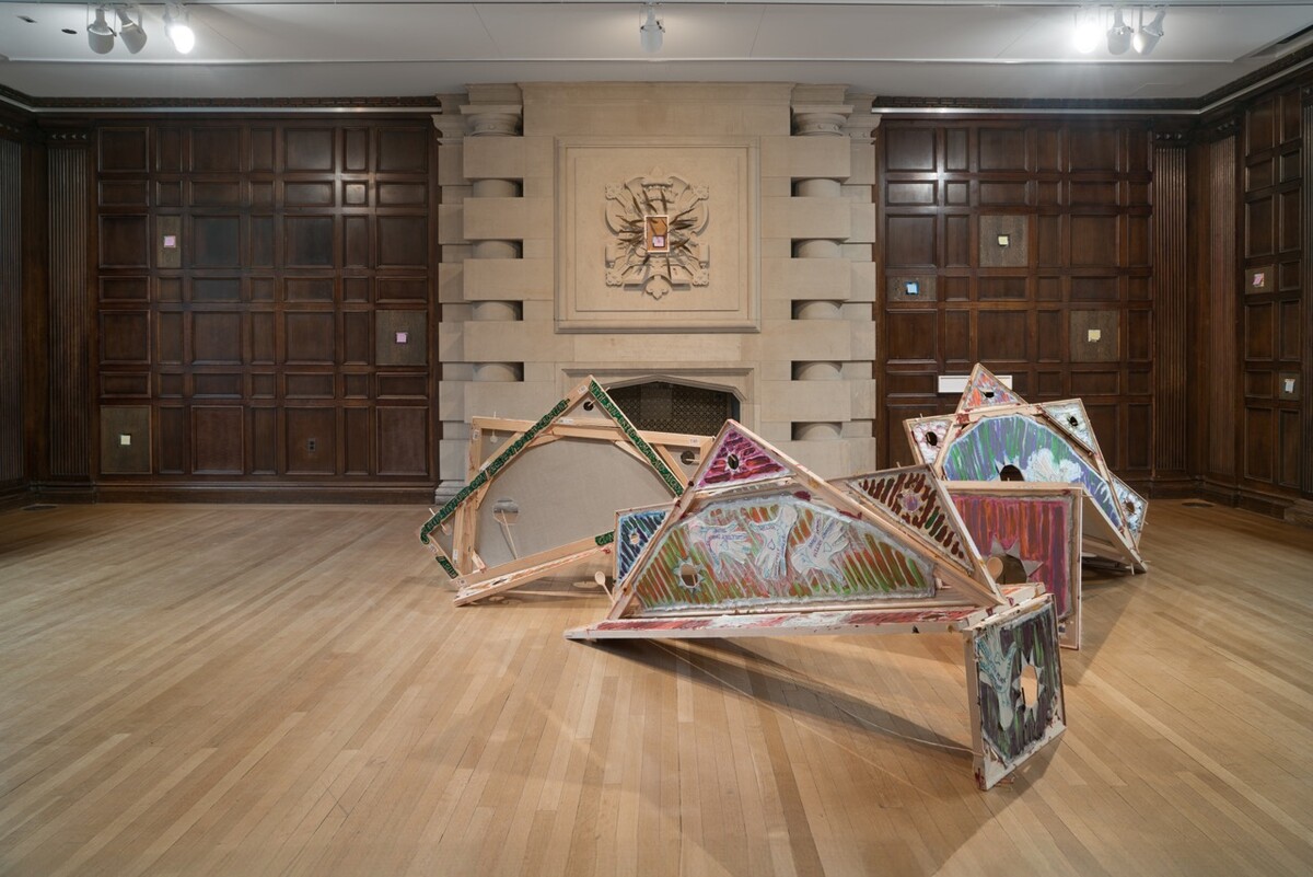 The great proto-minimalist painter Ad Reinhardt famously quipped that “sculpture is something you bump into when you back up to look at a painting.” In Story Structure, Pt. 2, a show conjoining the work of Chicago-based artists and real-life couple Mike Cloud and Nyeema Morgan, the opposite appears to be true. The exhibition, which will be on view at the Neubauer Collegium April 7 through June 28, 2026, presents mixed-media works from Morgan’s “Studies for Traps” series in a tautly orchestrated sequence along the gallery walls. Backing up to take them in, the viewer must navigate around three of Cloud’s large multi-panel paintings, which occupy the middle of the space much like sculptures.