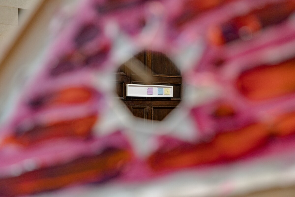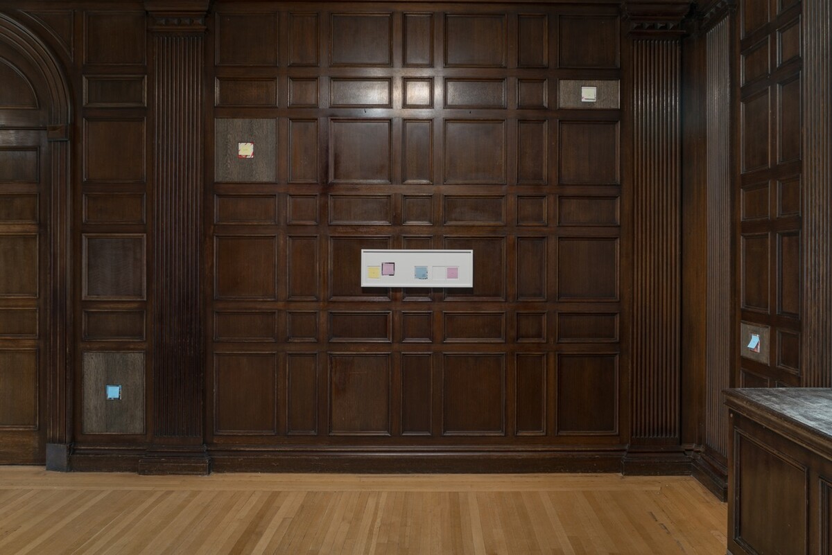 Although Cloud’s and Morgan’s works do not necessarily “mean” something in the way most contemporary art sets out to be “meaningful,” the riddle of making meaning is at the core of their respective practices. Morgan’s longstanding interest in frames and framing mirrors a profound suspicion of the various ways information is presented to us—of both context and subtext. Her “studies for traps,” composed of framing mats and Post-It notes, hint at the power of text and other authoritative modes of meaning-making to obscure and suppress as much as they reveal. At the same time, the works allude to the transgressive appeal of margins of all sorts—peripheral spaces in which the marginalized may flourish. Conversely, the frames in Cloud’s paintings don’t simply lend the pictures a sculptural quality; they are often inscribed with ideograms and graphic forms that invite a reading of the artist’s work as saturated with cosmic symbolism—of a kind that never fully satisfies our hunger for meaning. Cloud has made a series of paintings for this exhibition inspired by search results for the word “sun” on the New York Times website. These vaguely solar works, which simultaneously resemble a herd of meekly grazing stegosaurs, allude to the centrality of “information” in the artists’ practices—and to the evident challenges of navigating today’s unrelenting media streams.