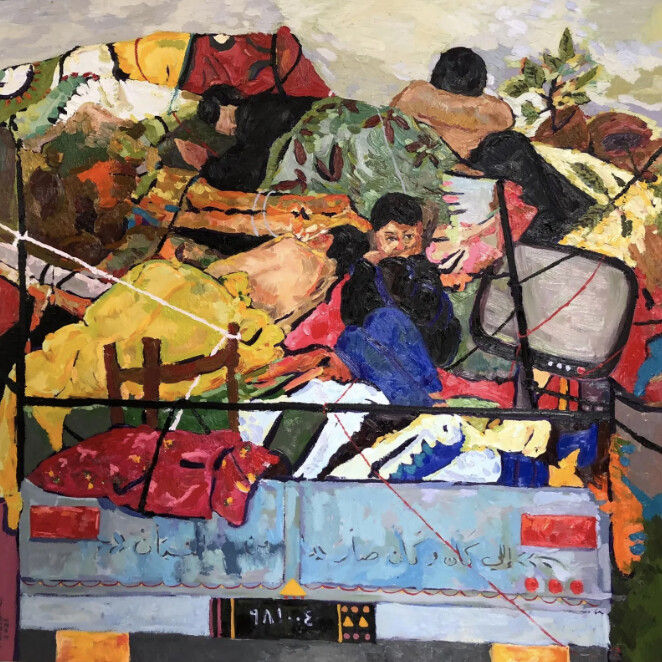 The rising Sweida-born painter Anas Albraehe was around 10 years old when he started painting. He later went on to study fine arts in Damascus and gained a Master’s degree in psychology and art therapy in Beirut. Inspired by the art of masters Henri Matisse and Paul Gauguin, Albraehe’s delicate and vibrant canvases exude quiet moments of humanity, tenderness and intimacy amidst situations of hardship. He has particularly devoted most of his work to portraying the restful act of sleeping. Whether bundled in the back of a truck or sharing a crowded space covered in blankets, everyone, be it a refugee, a worker or a friend, is equal when asleep. Today, the artist is based in Paris and has had his work displayed in notable art fairs around the world, including Art Dubai and Art Basel. @anasalbraehe