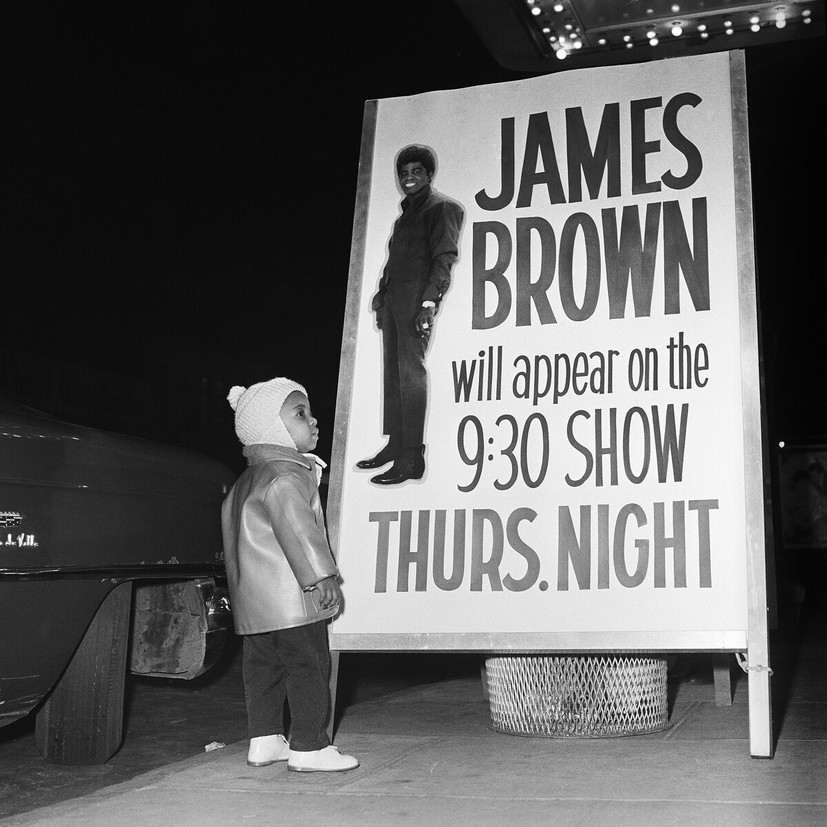 “This image captures a young child in front of an A-frame advertisement for a James Brown concert at the historic Apollo Theater in Harlem. The sign towers over the curious child as he takes in the moment. The contrast between the toddler’s wide-eyed gaze and the confident pose of Brown captures both the innocence of the child and the aspiration of Brown.