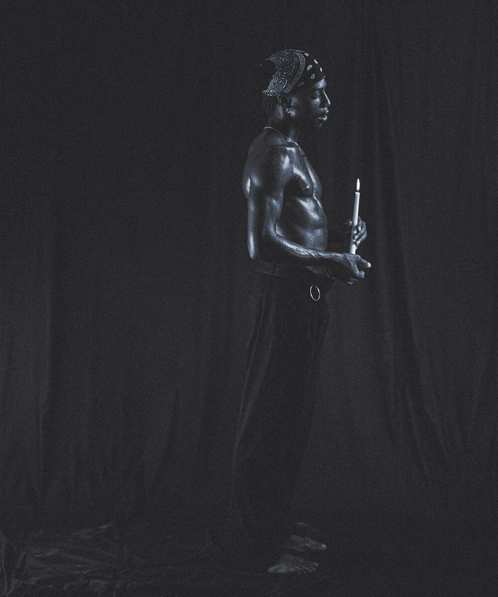 “My photograph Oche (With Candle) delves into the spiritual and emotional interiority of Black men, examining how the body holds memory, grief, and the possibility of spiritual elevation, all rendered through a deliberate blue tonality. As part of my series Notes Towards Becoming a Spill, this work reflects on the fluidity of identity, where Blackness, masculinity, and yearning are not fixed states but porous, ever-shifting forms. The candle functions both as a vessel and an emblem, conjuring ritual, remembrance, and illumination, while also embodying the delicate interplay between vulnerability and strength. By placing Oche in a soft, dimly lit, almost uterine environment, I aim to craft a sanctuary in which Black men are not confined to rigid definitions but allowed to remain malleable, free to soften, to feel, to yield. This image, like the series it belongs to, gestures toward the shedding of armor and an embrace of the sacred emotional fullness of becoming.”
