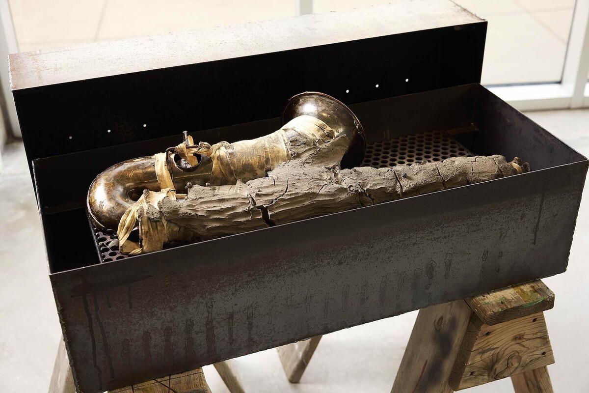 Jamal Cyrus, Horn Beam Sacrament, 2025. Sawhorses, custom-made steel and wood smoker, tenor saxophone, gauze, Mississippi River mud, sargassum, railroad spike, hardwood charcoal, cherry and hickory wood chips, residue from Mississippi River water, aloe, Twinkle silver polish, oud, frankincense and myrrh, 90.8 x 106.7 x 65.4 cm. Courtesy: the artist and PATRON, Los Angeles