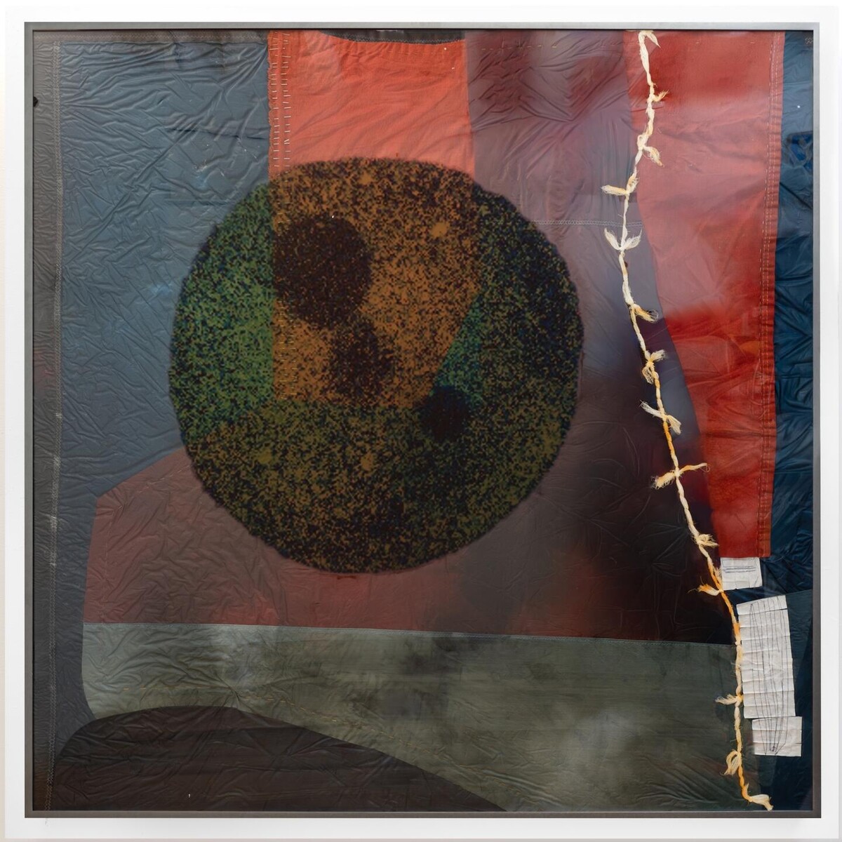Tamar Ettun, Embryo Collage 2, 2025. UV print on plexiglass, hand-dyed fabric, sails, gauze, pads, syringe wrappers, sewing pins, thread, aluminum frame, 49 x 49 in. Courtesy: the artist and dreamsong, Los Angeles