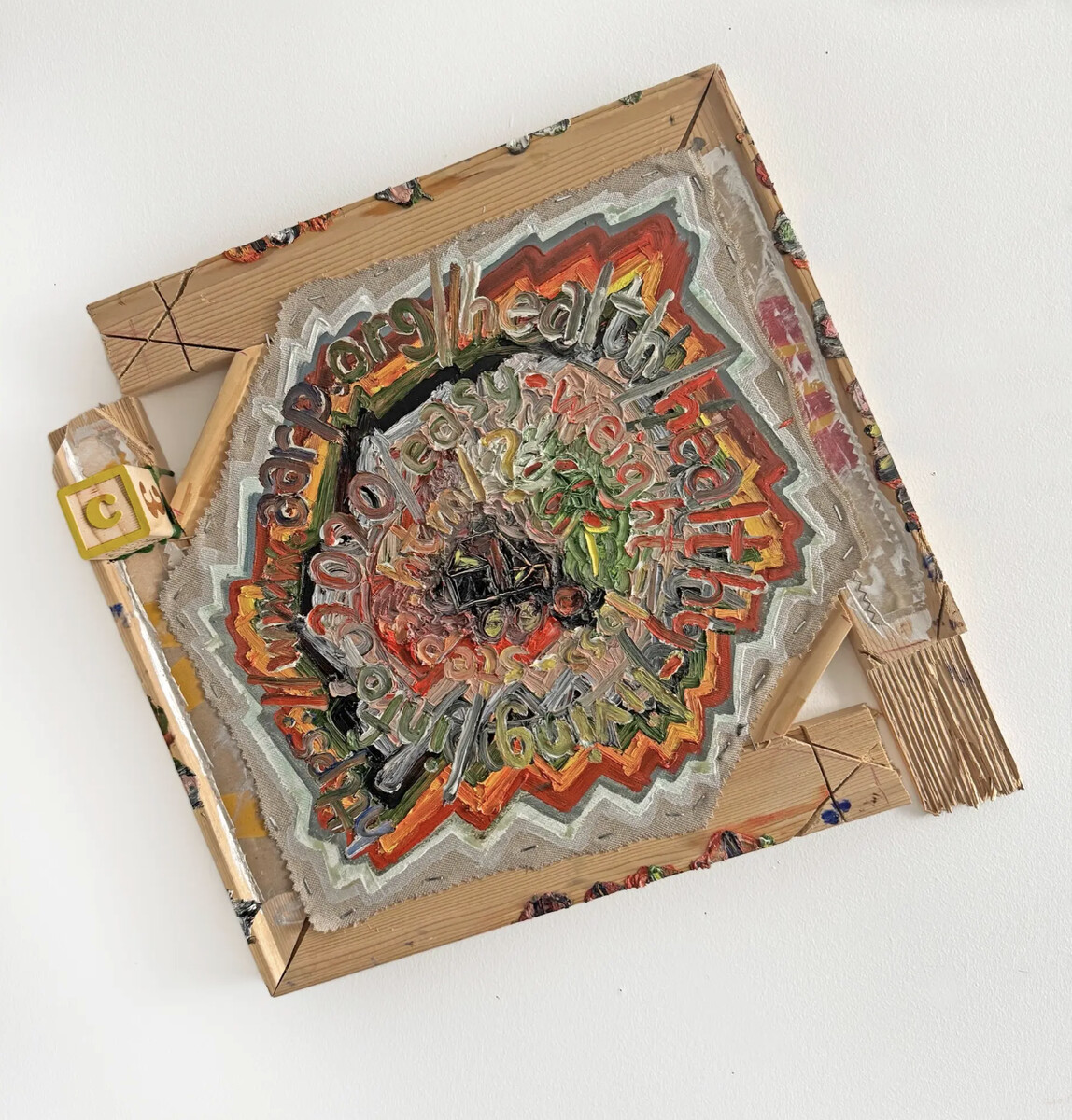 Mike Cloud, Weight Loss Advice, 2020. Oil on linen with toy, wood, and stretcher bars on linen, 24 × 24 × 2 ¾ inches. Courtesy the artist.