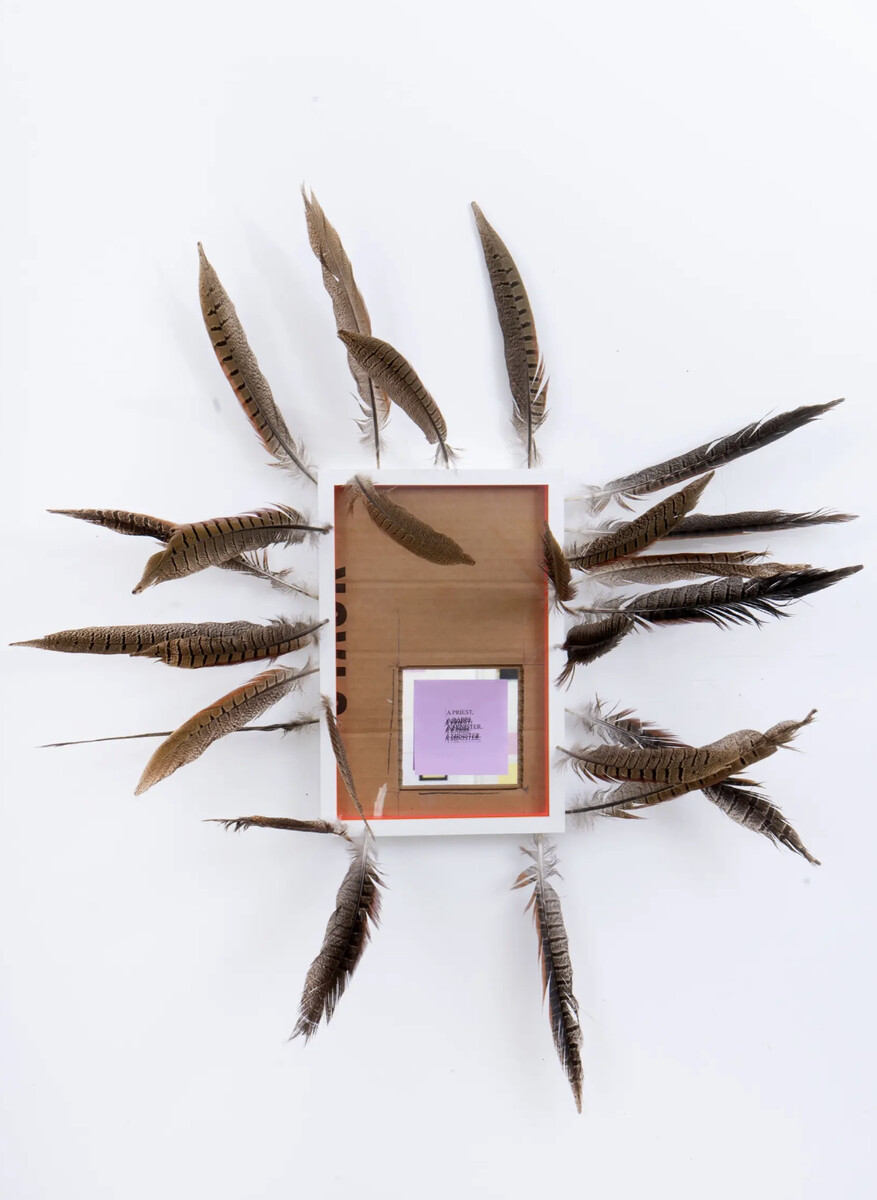 Nyeema Morgan, X (studies for traps), 2026. Letterpress print on paper with mixed paper media, glass mirror, acrylic, pheasant feathers, 30 × 27 × 10 inches. Courtesy the artist.