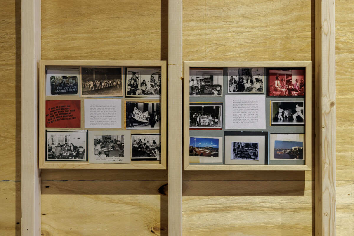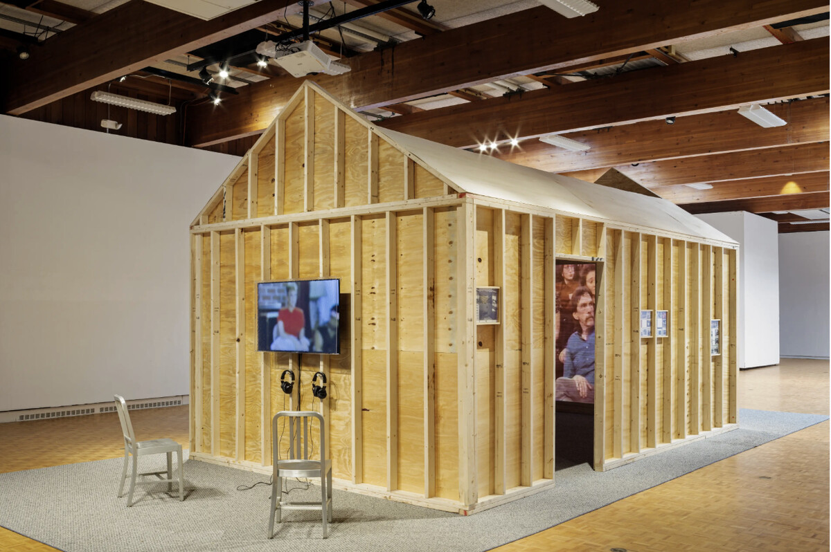 On one side of the house’s exterior, chairs face a TV monitor mounted on the wooden façade, where videos of what would have been called “battered women’s groups” play. An acrylic filter acting as a pane of frosted glass anonymizes survivors. Sharing experiences and seeking counsel, they challenge and console one another. They tell how they stayed, coped, and eventually left. On the structure’s other three sides, the collages hang—small framed works that pair typed excerpts from Winant’s interviews with Bako and photographs of Bako’s archive. Initially taken by Winant for research, the photographs show not just what Bako kept—protest signs, portraits of other activists, a copy of Rape Victimology—but how. Bako’s labels and folders, framed by Winant’s lens, show the activist’s own investment in organizing and preserving histories. Winant’s collages continue this archival impulse, affixing the physical matter and recounted episodes of Bako’s life onto single planes. There is a gravity to Bako’s stories—an early sexual humiliation fueled by misogyny, a friend’s funeral, and a reflection that she really entered domestic violence work to save her mother from her father. I was four collages in before realizing the accounts all belonged to one woman. For Bako, this onslaught of experiences was transformative, binding her grief and political conviction: “Each little piece of this horror kept on molding me. Each piece cemented my life’s work,” she told Winant and one of the collage’s quotes. Together, on the outside of a home neither inhabits, Bako and the women’s groups form something like solidarity across media. Just inside the home, a second TV monitor displays participants in the men’s groups sharing family histories and internalized cycles of violence. We encounter them, deliberately, inside the threshold. The women, while fixed to the outside of this violent domestic space, direct their gazes beyond it.